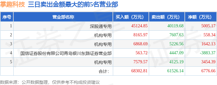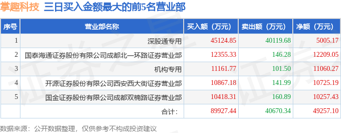 1月13日掌趣科技(300315)龙虎榜数据:机构净买入1.67亿元(3日),北向资金净买入5005.17万元(3日)