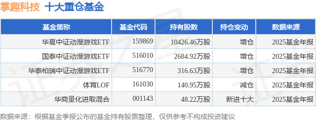 根据2025基金年报公募基金重仓股数据,重仓该股的公募基金共5家,其中持有数量最多的公募基金为华夏基金的华夏中证动漫游戏ETF。华夏中证动漫游戏ETF目前规模为126.11亿元,最新净值1.4023(3月12日),较上一交易日下跌1.41%,近一年上涨13.43%。该公募基金现任基金经理为鲁亚运。鲁亚运在任的基金产品包括:华夏创业板成长ETF联接A,管理时间为2022年6月10日至今,期间收益率为5.3%;华夏中证全指证券公司ETF联接A,管理时间为2022年6月10日至今,期间收益率为21.42%;华夏国证疫苗与生物科技指数发起A,管理时间为2022年9月6日至今,期间收益率为-35.91%;华夏战略新兴成指ETF联接A,管理时间为2023年3月27日至今,期间收益率为34.57%。