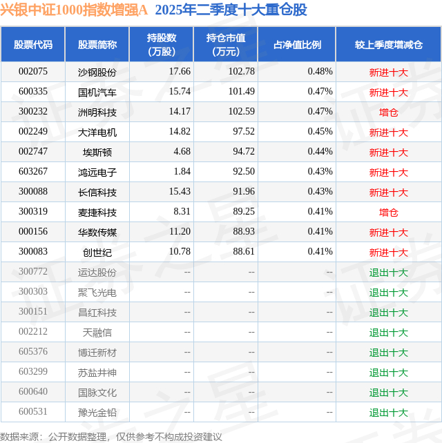 兴银中证1000指数增强A的前十大重仓股如下: