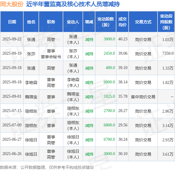 同大股份近半年内的董监高及核心技术人员增减持详情如下: