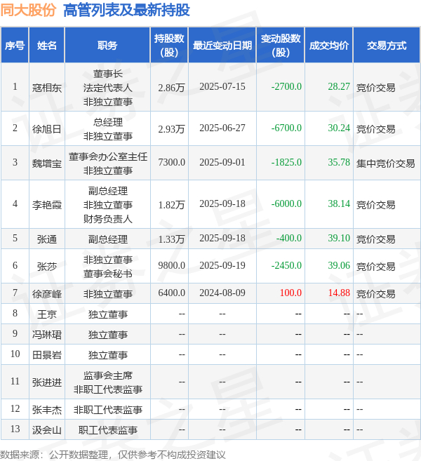 同大股份的高管列表及最新持股情况如下: