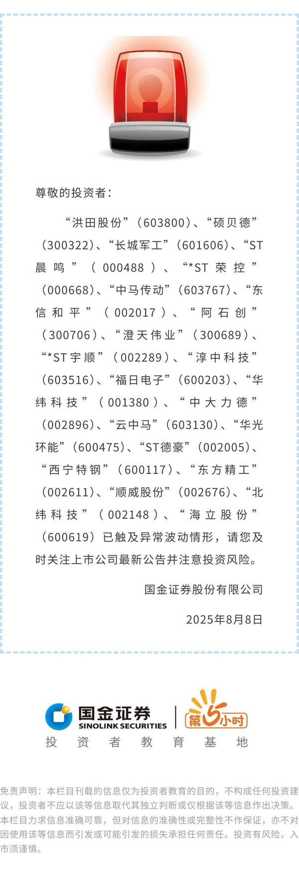 关于“洪田股份”、“硕贝德”等证券交易异常波动的风险提示