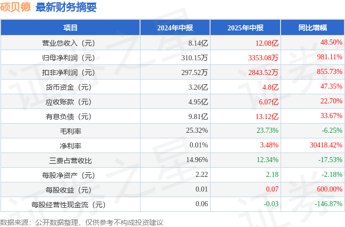 据证券之星公开数据整理,近期硕贝德(300322)发布2025年中报。根据财报显示,硕贝德营收净利润同比双双增长。截至本报告期末,公司营业总收入12.08亿元,同比上升48.5%,归母净利润3353.08万元,同比上升981.11%。按单季度数据看,第二季度营业总收入6.91亿元,同比上升54.04%,第二季度归母净利润1900.54万元,同比上升67.42%。