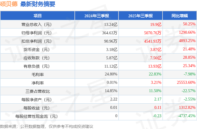 据证券之星公开数据整理,近期硕贝德(300322)发布2025年三季报。截至本报告期末,公司营业总收入19.9亿元,同比上升50.25%,归母净利润5070.76万元,同比上升1290.66%。按单季度数据看,第三季度营业总收入7.82亿元,同比上升53.05%,第三季度归母净利润1717.67万元,同比上升3052.98%。本报告期硕贝德公司应收账款体量较大,当期应收账款占最新年报营业总收入比达40.71%。