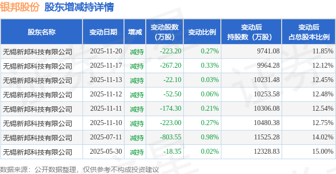 截至2025年11月24日收盘,银邦股份(300337)报收于10.01元,上涨4.05%,换手率2.85%,成交量20.3万手,成交额2.01亿元。