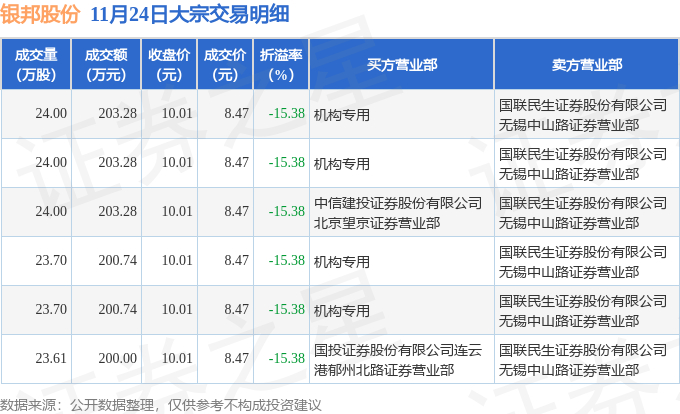 11月24日银邦股份现6笔折价15.38%的大宗交易 合计成交1211.32万元