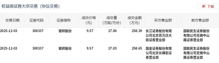 12月3日,银邦股份大宗交易成交54.03万股,成交额517.04万元,占当日总成交额的0.42%,成交价9.57元,较市场收盘价11.41元折价16.13%。