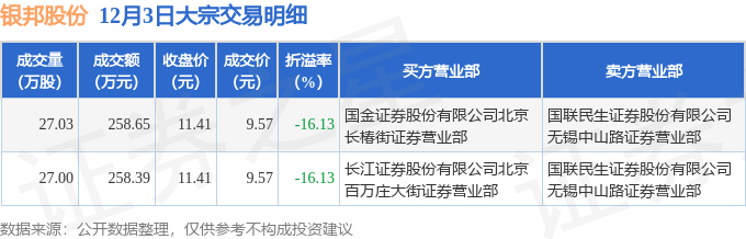 12月3日银邦股份现2笔折价16.13%的大宗交易 合计成交517.04万元