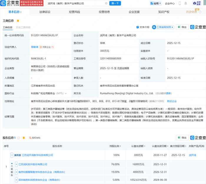 企查查APP显示,近日,润开鸿(南京)数字产业有限公司成立,法定代表人为骆敏清,经营范围包含:数字技术服务;软件开发;信息技术咨询服务;数据处理和存储支持服务;电子产品销售等。企查查股权穿透显示,该公司由江苏润开鸿数字科技有限公司全资持股,后者由润和软件(300339)、深圳哈勃科技投资合伙企业(有限合伙)等共同持股。