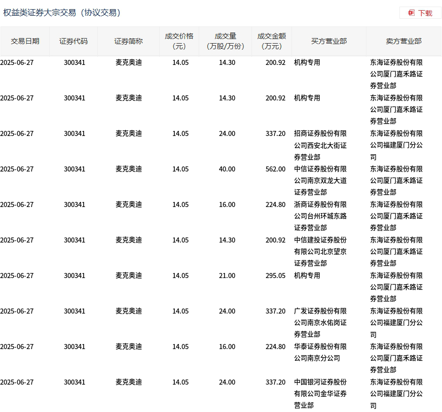 麦克奥迪今日大宗交易折价成交207.9万股,成交额2921.01万元