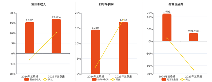 公司营业总收入为10.99亿元,较去年同报告期营业总收入增加1.03亿元,同比较去年同期上涨10.35%。归母净利润为1.44亿元,较去年同报告期归母净利润增加2183.74万元,实现2年连续上涨,同比较去年同期上涨17.86%。经营活动现金净流入为4926.96万元。