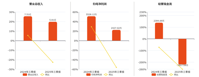 公司营业总收入为5.81亿元,较去年同报告期营业总收入减少1.71亿元,同比较去年同期下降22.75%。归母净利润为2427.02万元,较去年同报告期归母净利润减少3101.10万元,同比较去年同期下降56.10%。经营活动现金净流入为-3827.09万元,较去年同报告期经营活动现金净流入减少6221.77万元,同比较去年同期下降259.82%。