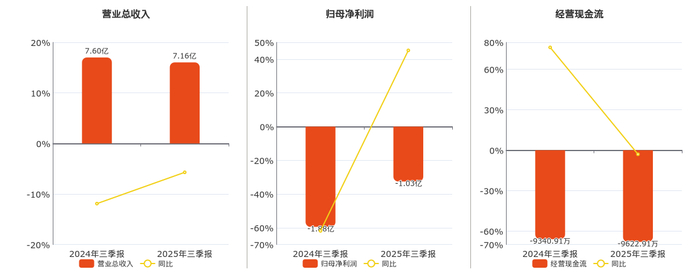 公司营业总收入为7.16亿元,较去年同报告期营业总收入减少4336.42万元,同比较去年同期下降5.71%。归母净利润为-1.03亿元。经营活动现金净流入为-9622.91万元,较去年同报告期经营活动现金净流入减少282.00万元。
