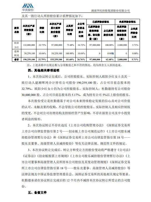 欧阳少红和建湘晖鸿分别持有华民股份132,000,000股和88,259,100,合计220,259,100股,转让杜勤德3000万股后,持股数将减少至190,259,100,持股比例将由37.96%降至32.79%,仍为控股股东。