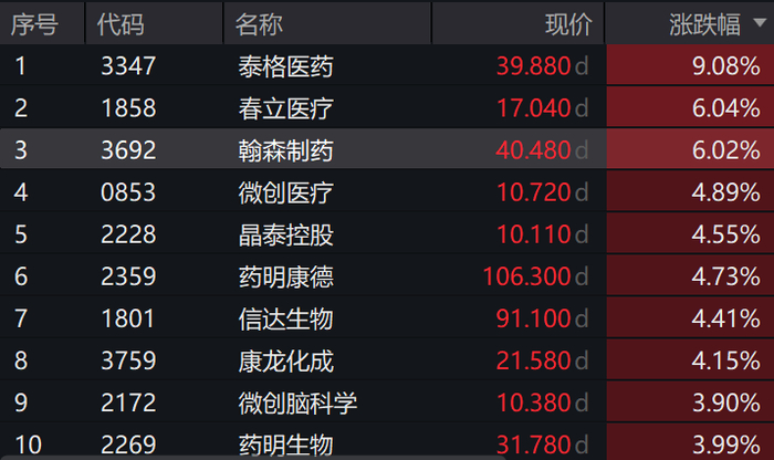 CRO概念股集体回暖。截至2025年11月24日14:30,中证港股通医疗主题指数(932069)强势上涨2.73%,成分股泰格医药(03347)涨超9%,翰森制药(03692),微创医疗(00853),药明康德(02359)等个股跟涨。