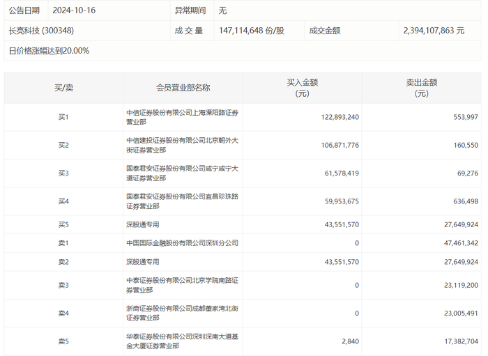 长亮科技今日涨停,龙虎榜数据显示,上榜营业部席位全天成交5.35亿元,占当日总成交金额比例为22.34%。其中,买入金额为3.95亿元,卖出金额为1.4亿元,合计净买入2.55亿元。