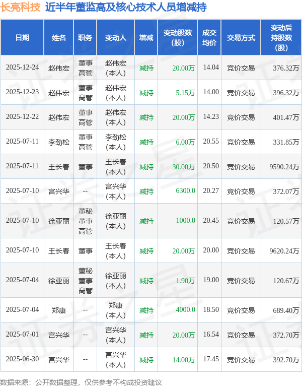 长亮科技近半年内的董监高及核心技术人员增减持详情如下: