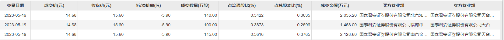 5月19日大宗交易成交385万股,成交额5651.8万元,占当日总成交额的20.58%,成交价14.68元,较市场收盘价15.6元折价5.9%。