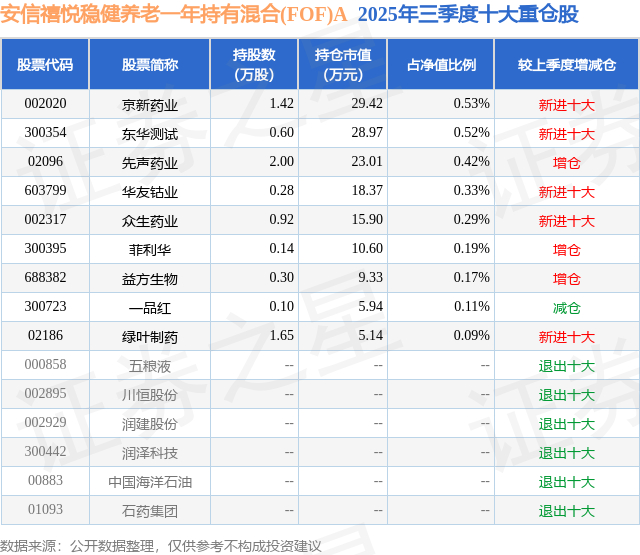 安信禧悦稳健养老一年持有混合(FOF)A的前十大重仓股如下: