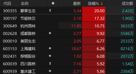 上证报中国证券网讯 10月14日早盘,建筑装饰板块拉升走高。截至9时35分,蒙草生态20cm涨停,节能铁汉涨超17%,杭州园林涨逾10%,美丽生态、上海建科、四川路桥等跟涨。此前,成都路桥涨停。