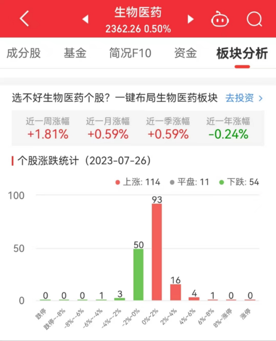 中国经济网北京7月26日讯今日,生物医药板块整体涨幅0.50%,其中114只股票上涨,11只股票平盘,54只股票下跌。