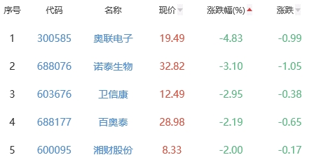 奥联电子、诺泰生物、卫信康、百奥泰、湘财股份位列涨幅榜后五位,涨幅分别为-4.83%、-3.10%、-2.95%、-2.19%、-2.00%。