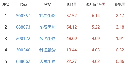 其中,我武生物、毕得医药、智飞生物、科恒股份、迈威生物位列板块涨幅前五位,涨幅分别为6.14%、5.22%、4.09%、4.03%、4.02%。
