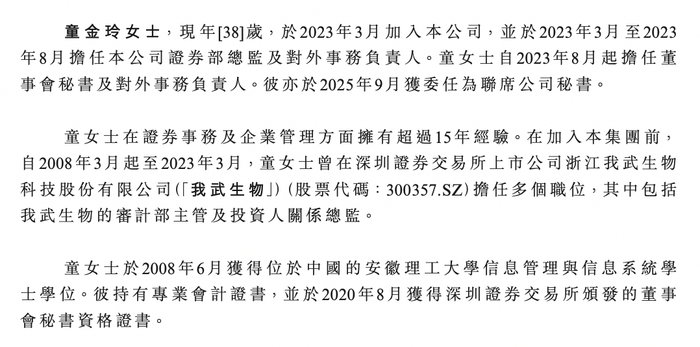 另外,童金玲女士,现年38岁,于2023年3月加入公司,并于2023年3月至2023年8月担任公司证券部总监及对外事务负责人。童金玲自2023年8月起担任董事会秘书及对外事务负责人。其亦于2025年9月获委任为联席公司秘书。