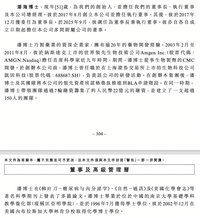 资料显示,潘海博士,现年51岁,为创始人,并担任公司董事长、执行董事及公司总经理。其于2017年8月创立公司并担任执行董事。其后,其于2017年12月获委任为董事长。于2025年9月,其调任为董事长兼执行董事。其亦自各自成立日期起担任公司多间附属公司的董事。