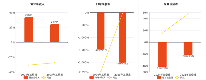 公司营业总收入为2.07亿元,在已披露的同业公司中排名第10,较去年同报告期营业总收入减少7891.98万元,同比较去年同期下降27.65%。归母净利润为-5598.18万元,在已披露的同业公司中排名第11,较去年同报告期归母净利润减少1467.26万元。经营活动现金净流入为-4807.01万元,在已披露的同业公司中排名第8,较去年同报告期经营活动现金净流入增加4366.40万元,实现2年连续上涨。