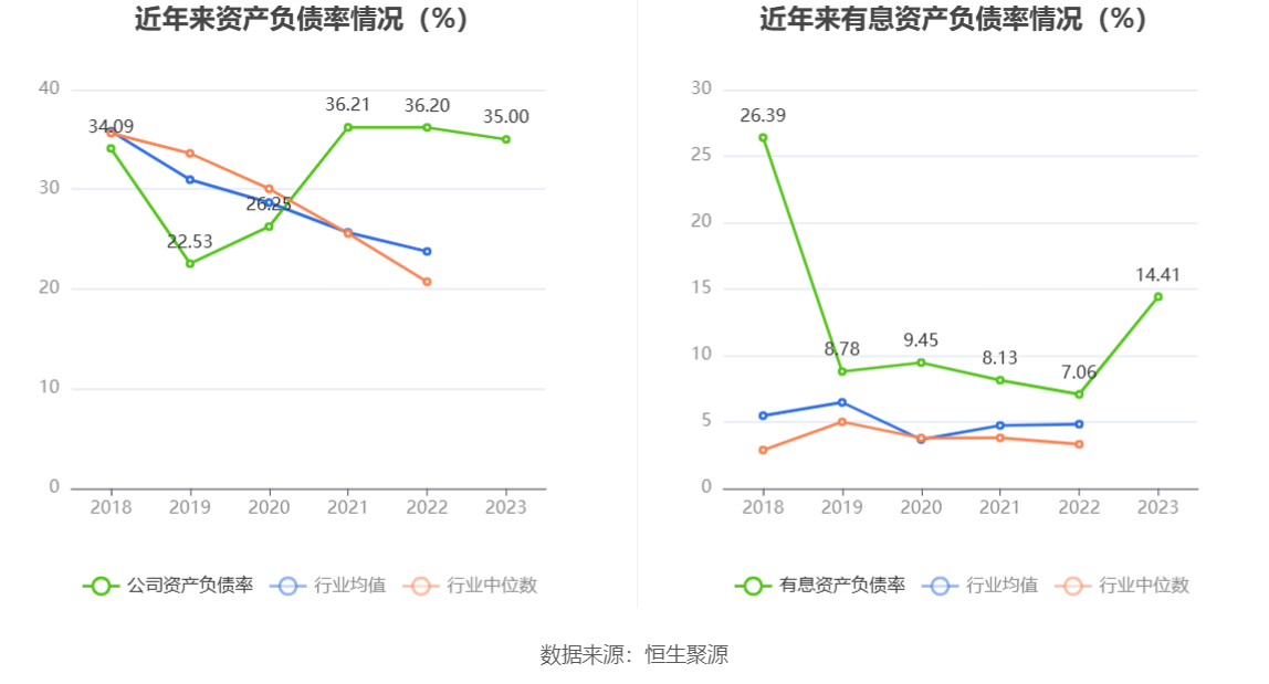 在偿债能力方面,公司2023年年末资产负债率为35.00%,相比上年末下降1.20个百分点;有息资产负债率为14.41%,相比上年末上升7.35个百分点。
