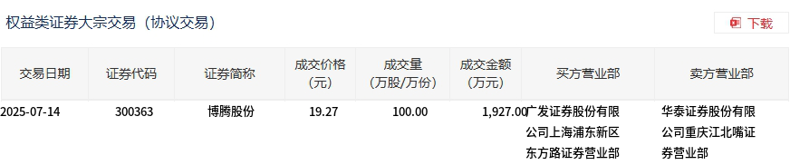 博腾股份今日大宗交易折价成交100万股,成交额1927万元