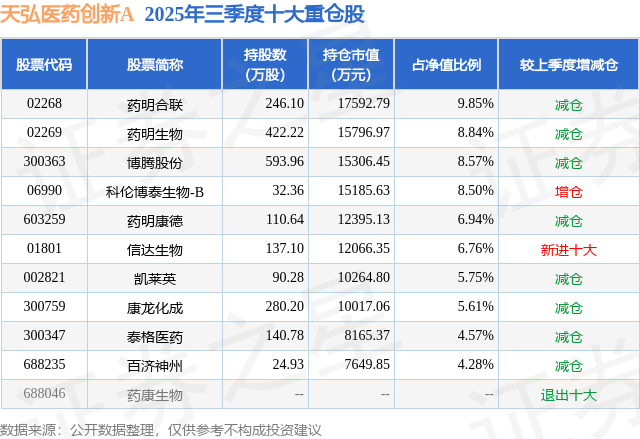 根据2025基金Q3季报公募基金重仓股数据,重仓该股的公募基金共8家,其中持有数量最多的公募基金为天弘基金的天弘医药创新A。天弘医药创新A目前规模为7.87亿元,最新净值1.1562(1月12日),较上一交易日上涨0.43%,近一年上涨63.77%。该公募基金现任基金经理为刘盟盟。刘盟盟在任的基金产品包括:天弘匠心臻选混合发起A,管理时间为2024年7月5日至今,期间收益率为37.99%;天弘阿尔法优选混合A,管理时间为2024年10月24日至今,期间收益率为19.22%;天弘臻选健康混合A,管理时间为2025年9月30日至今,期间收益率为-1.85%。