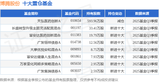 根据2025基金Q3季报公募基金重仓股数据,重仓该股的公募基金共8家,其中持有数量最多的公募基金为天弘基金的天弘医药创新A。天弘医药创新A目前规模为7.87亿元,最新净值1.1856(1月13日),较上一交易日上涨2.54%,近一年上涨69.18%。该公募基金现任基金经理为刘盟盟。刘盟盟在任的基金产品包括:天弘匠心臻选混合发起A,管理时间为2024年7月5日至今,期间收益率为38.26%;天弘阿尔法优选混合A,管理时间为2024年10月24日至今,期间收益率为19.43%;天弘臻选健康混合A,管理时间为2025年9月30日至今,期间收益率为-1.5%。