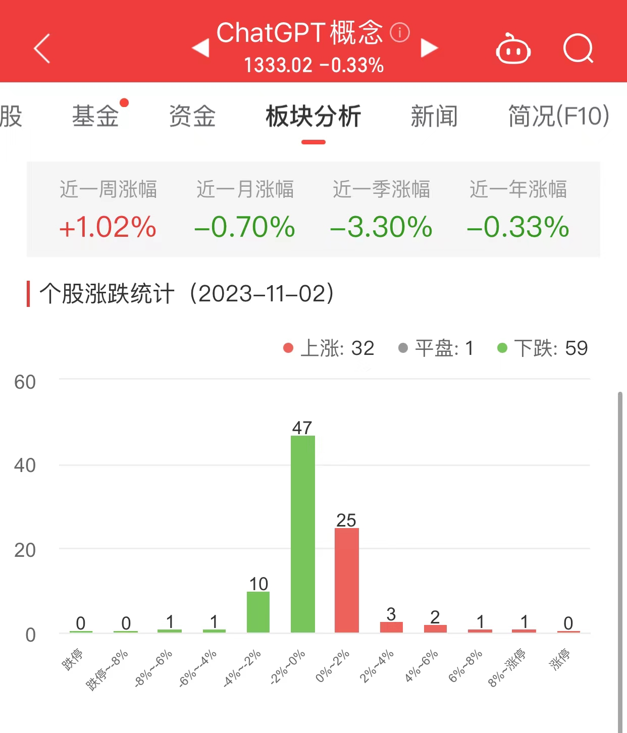 中国经济网北京11月2日讯今日,ChatGPT概念板块整体跌幅0.33%,其中32只股票上涨,1只股票平盘,59只股票下跌。