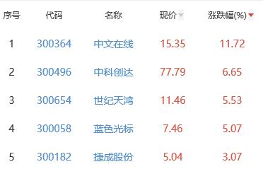 其中,中文在线、中科创达、世纪天鸿、蓝色光标、捷成股份位列板块涨幅前五位,涨幅分别为11.72%、6.65%、5.53%、5.07%、3.07%。