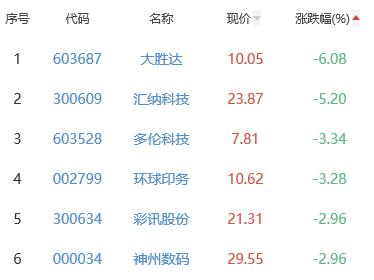 大胜达、汇纳科技、多伦科技、环球印务、彩讯股份、神州数码位列涨幅榜后五位,涨幅分别为-6.08%、-5.20%、-3.34%、-3.28%、-2.96%、-2.96%。