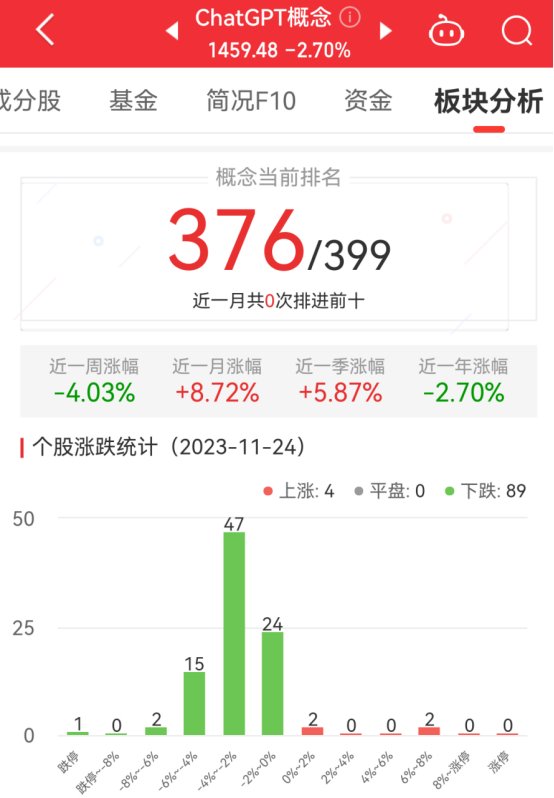 中国经济网北京11月24日讯今日,ChatGPT概念板块整体跌幅2.70%,其中4只股票上涨,0只股票平盘,89只股票下跌。