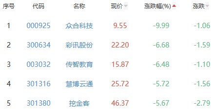 众合科技、彩讯股份、传智教育、慧博云通、挖金客位列涨幅榜后五位,涨幅分别为-9.99%、-6.68%、-6.48%、-5.72%、-5.67%。
