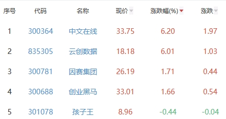 其中,中文在线、云创数据、因赛集团、创业黑马、孩子王位列板块涨幅前五位,涨幅分别为6.20%、6.01%、1.71%、1.66%、-0.44%。