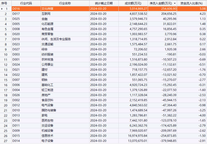 上证报中国证券网讯 Choice数据统计,今日A股主力资金净流出90.35亿元;行业方面,文化传媒净流入居首,高达25.46亿元,互联网净流入20.47亿元,金融净流入4.03亿元;净流出金额最多的是电子设备,为37.99亿元,信息技术净流出25.49亿元,机械设备净流出20.91亿元。个股方面,主力资金净流入前三的是中文在线、昆仑万维、科大讯飞,分别净流入5.21亿元、4.85亿元、3.44亿元;净流出前三的是药明康德、中际旭创、电广传媒,分别净流出8.21亿元、6亿元、4.92亿元。