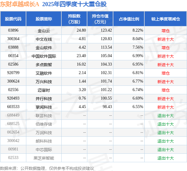 根据2025基金年报公募基金重仓股数据,重仓该股的公募基金共1家,其中持有数量最多的公募基金为东财基金的东财卓越成长A。东财卓越成长A目前规模为0.14亿元,最新净值1.7594(1月15日),较上一交易日下跌2.01%,近一年上涨77.68%。该公募基金现任基金经理为孙辰阳。孙辰阳在任的基金产品包括:东财远见成长A,管理时间为2023年4月11日至今,期间收益率为8.43%;
