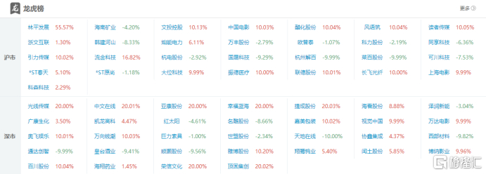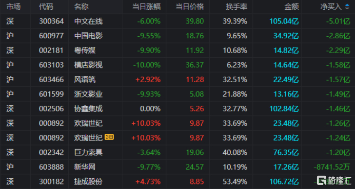 龙虎榜单日净卖出额前三为中文在线、中国电影、粤传媒,分别为5.01亿元、2.86亿元、2.29亿元。