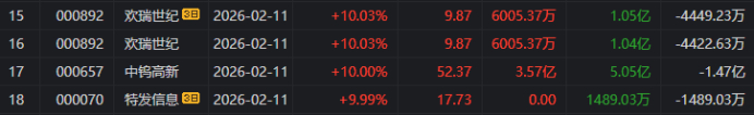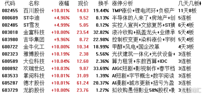 高位股方面,百川股份11天8板,ST中迪5连板,ST雪发6天4板,金富科技、吉华集团5天4板,金牛化工4天3板。