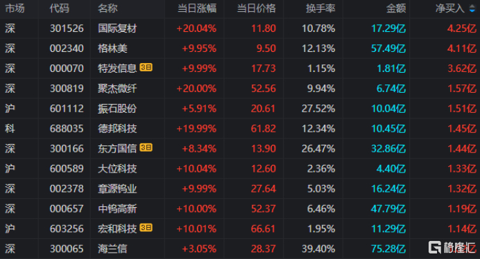 龙虎榜单日净买入额前三为国际复材、格林美、聚杰微纤,分别为4.25亿元、4.11亿元、1.57亿元。