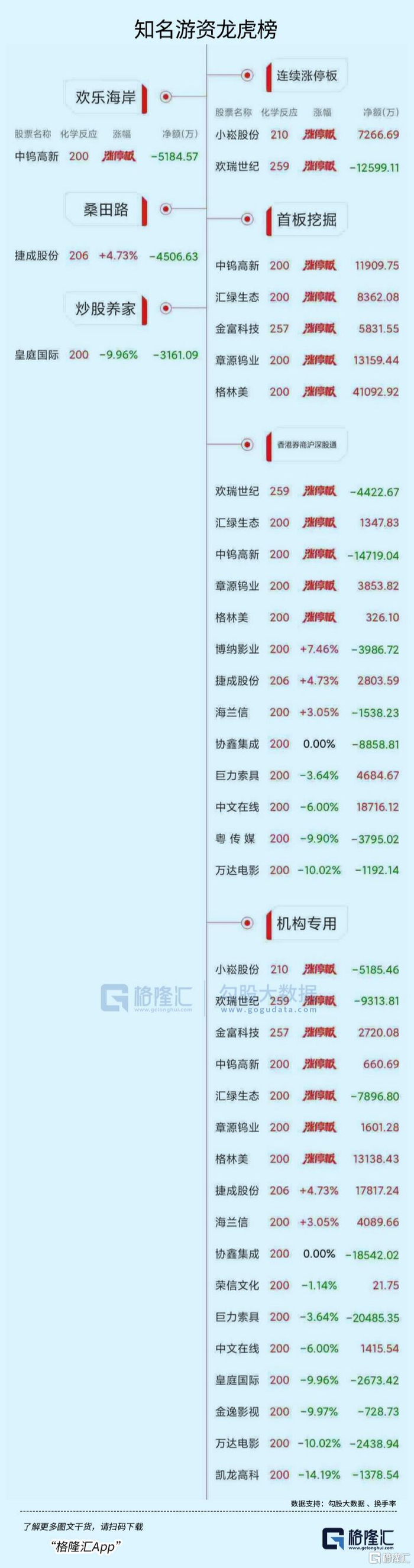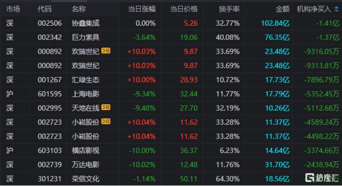 欢瑞世纪:今日涨停,全天换手率33.69%,成交额23.48亿元。机构净卖出9313.81万元,深股通净卖出4422.67万元,营业部席位合计净买入1137.37万元。