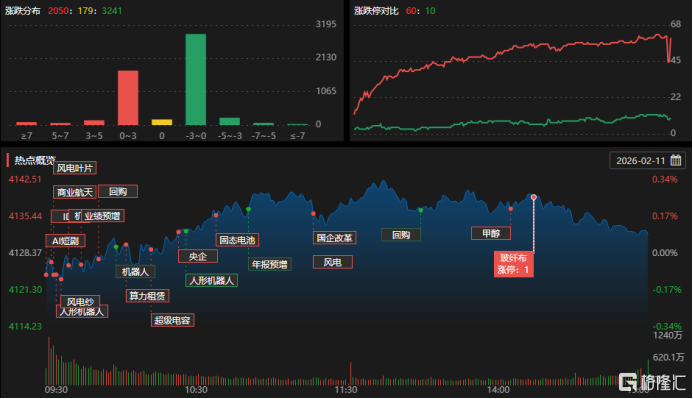 2月11日,沪深两市成交额跌破2万亿,较上一个交易日缩量1213亿。板块方面,玻璃玻纤、小金属、磷化工、化肥等板块走高;文化传媒、AI语料及Sora概念、旅游概念、培育钻石等板块下挫。