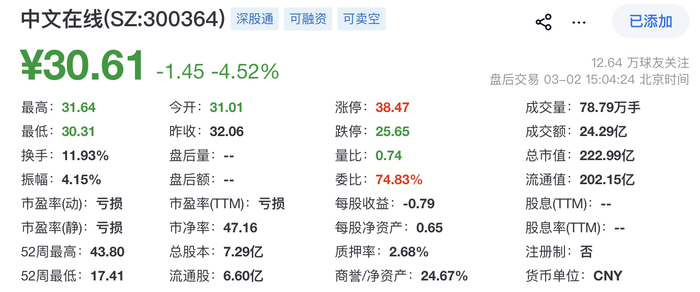 截至发稿时,中文在线A股报30.61元,总市值约222.99亿元。