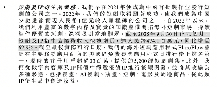 根据弗若斯特沙利文数据,按2024年收入计,公司在中国网络文学市场的版权驱动型内容平台中排名第三,市场份额为1.6%;在海外短剧平台中,公司按2025年9月的收入计排名第八,按在上线后首七个月期间的月活跃用户计排名第二。