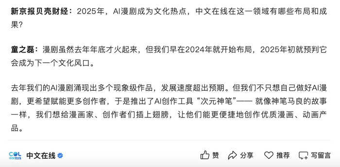 今年1月26日,童之磊在访谈中提到,漫剧虽然去年年底才火起来,但公司早在2024年就开始布局,2025年初就预判它会成为下一个文化风口。